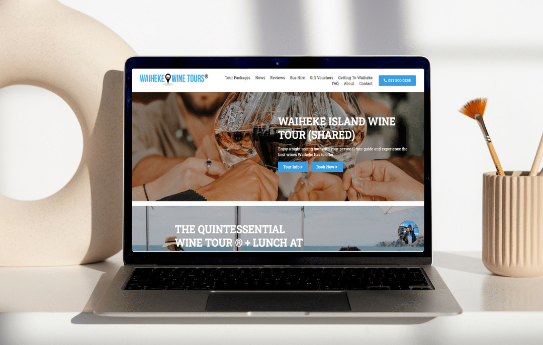 Showcasing Waiheke Wine Tours’ digital presence with a sleek, strategically designed website paired with expert SEO, Google Ads, hosting and ongoing brand advisory. The result is a purpose-built platform that elevates their online visibility and supports continued growth in one of New Zealand’s most‑reviewed wine tour experiences.